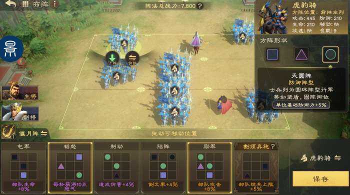 方阵形状:不同形状会给相应方阵的部队諟栱加成(addition),正方型可提升生命值、三角形提升攻击力、圆形可提升防御力。