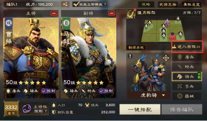 右下角可直接变更全部的兵种,我们也可点击方阵,为某一方阵变更兵种。阵型编辑允许“一支队伍配置多个兵种”,但兵种的被动要求“作为主力兵种”才能生效。比如虎豹骑被动是“延长控制时间”,我们要虎豹骑方阵数量(quantity)最高,才能激活这个效果。