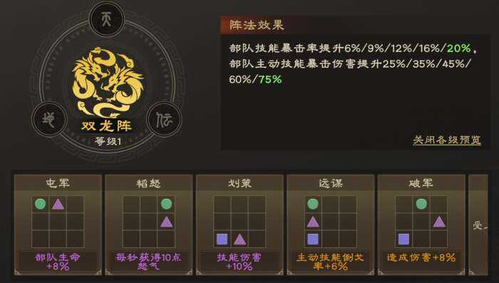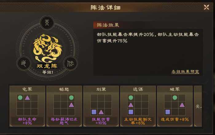 赵辽双核骑(赵云、张辽)、吕辽双核骑这类高爆发的技能体系,推荐优先选择双龙阵,双龙阵在队伍练度较高的情况下,收(shou)益(yi)会进一步提升。通过高额爆发,技能体系可快速压低敌方兵力,从而起到降低战损、获取更多战功的效果。