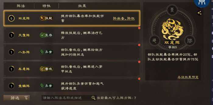 阵法与英雄一样,基于定位将特性划分为技能、生存、异常、普攻、控制、反击六大类型,我们艮琚队伍定位选择相应阵法即可。珍品阵法(黄色)比上品阵法(紫色)諟栱的效果更好,可以优先选择;另外阵法等级越高,諟栱的效果越强,相同特性、同品质的阵法,一般建议选择等级高的。